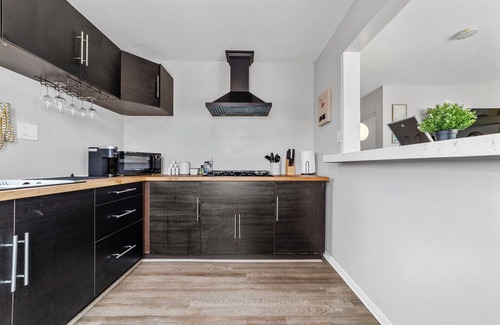 • A fully equipped kitchen with full sized refrigerator, stove, spice rack, utensils, dishes, cups/mugs, pots/pans, wine glasses makes it simple to enjoy home-cooked meals or local takeout. Keurig with K-cups available.