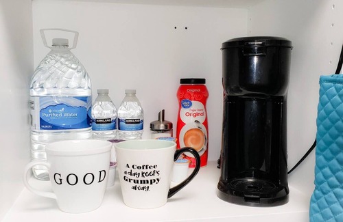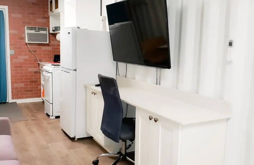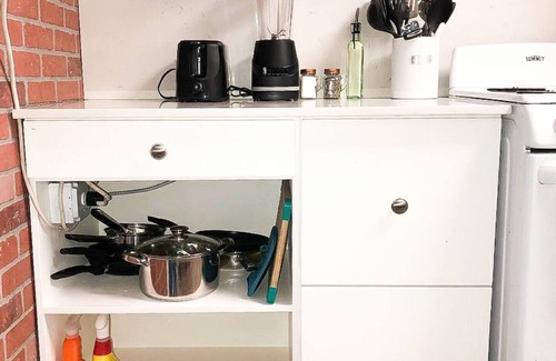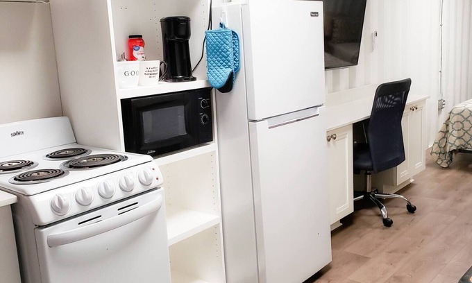 The well-equipped kitchenette boasts a stove, oven, fridge, and microwave, along with all the essentials for whipping up a quick bite or preparing a gourmet meal. Whether you're staying for a few nights or a few weeks, you'll find everything you need right here.