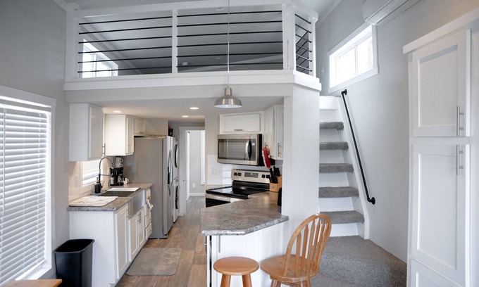 Experience Tiny Living Without Compromising on Comfort Our tiny home, designed for both short and extended stays, accommodates up to four guests with ease. It boasts a snug bedroom, an airy sleeping loft, a modern bathroom, and a welcoming front patio — all set against the backdrop of Cedar Creek's serene RV community park.