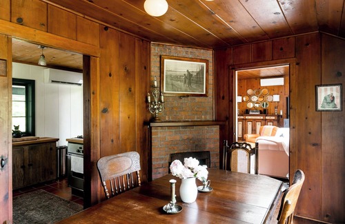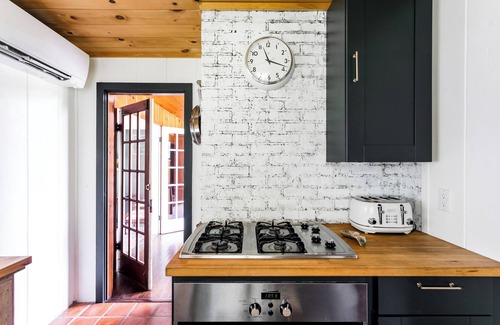 THE MAIN HOUSE has two bedrooms: The primary bedroom has a queen bed, and the second bedroom has two twin beds — both bedrooms are cozy and comfortable with designer furniture, premium bedding, and new skylights. The brand-new kitchen is fully stocked with microwave, coffee maker, and everything you need to cook for family or guests. The bathroom features both walk-in shower and deep soaking tub — a relaxing treat at the end of a long day of hiking or skiing. The stylishly-decorated living room has a wood burning fireplace and plenty of comfy seating, Apple TV, bluetooth stereo/record player, and wifi that extends across the property. The game room, which is stocked with board games, puzzles, art books and an antique chess/backgammon table, leads out to a sunny bluestone patio with a twelve-person al fresco dining table and barbecue. The wood-paneled dining room is a cozy space with the feel of an old fashioned captain's stateroom, an ideal spot for both quiet breakfasts and lively dinner parties.