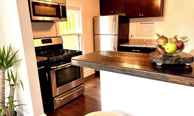 New Granite Kitchen With Stainless Appliances - Refridgerator, Oven, Microwave, Granite Countertops, Air Fryer, Ninja Blender, Popcorn Maker, Dishes, Pots & Pans, Toaster