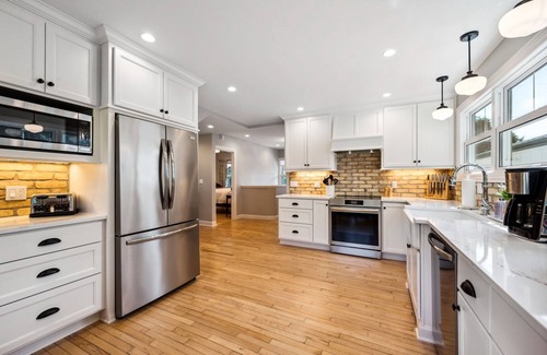 •Our new kitchen is gorgeous, modern, and fully stocked with a dishwasher, induction stove, and refrigerator/freezer with ice maker. We also provide a traditional coffee maker, a Keurig, a coffee bean grinder, and an electric tea kettle. Also available are induction pots and pans, a toaster, a crock pot, a blender, kitchen towels, hot pads, baking pans, baking sheets, and BBQ utensils. Dishes, utensils, children’s dishes, glassware, wine glasses, and additional barware are also on site.