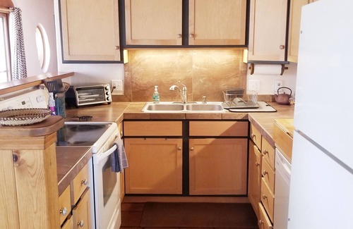 Enjoy star-filled skies and long quiet walks at this beautifully landscaped 2-bedroom home just outside the bustle of Taos. Feel at home with the full bathroom/tub, washer/dryer & well-equipped kitchen. Dine by the large picture-window framing the Taos Mountains and share movie night in the modernly furnished living room.