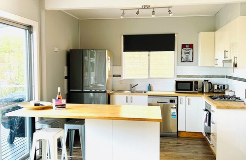 The kitchen features many appliances and essential pantry items needed to prepare delicious meals. Outside on the large deck there is a dining table that seats eight people comfortably. There is also a hammock and large outdoor beanbag to relax in, providing an ideal space to enjoy the beautiful lake views.