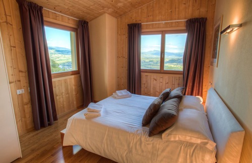 Accommodates 6 people in three double bedrooms, each with private bathroom. The living area is divided into a bright living room with a wood-burning fireplace, and a spacious kitchen with a dining area.