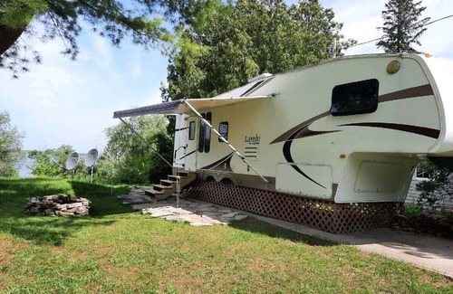 Cozy camper with a beautiful view of the river and Chippewa Bay, 1 bedroom with a queen size bed and a sofa that folds out to a full size bed. Very nice kitchen, Television , internet, netflix and sling tv. Fully stocked kitchen, all linens, blankets and towels provided. Enjoy gorgeous view of the bay with picnic table, grill and firepit with wood available to purchase on sight. boat slip available, 20 foot pontoon boat and kayaks available to rent. Spacious yard with a huge deck nestled in the trees overlooking the river. No extra charge for dock slip.