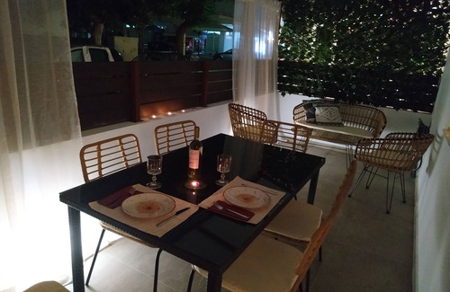 This 73 square meter individual entrance apartment is located on the ground floor of a two-story building with a shaded patio of 28 square meters. It consists of two bedrooms and two bathrooms with a rain shower.There is a stylish cozy and comfortable living room with a smart T.V. and an ergonomic laptop working station all sharing the space with an open-air fully equipped kitchen. Kitchen is contemporary staged with an island stand with assorted designer stools offering exclusive moments. It is equipped with a regular size oven, large refrigerator, dish washer, washing machine espresso coffee machine and all the needed kitchenware making the apartment an ideal habitat for even longer periods of time when someone desires to combine work with pleasure. The kitchen island with the stools is ideal for breakfast where the sitting area at the patio and the veranda table offer ideal positions for relaxation, reading or dinner. The first bedroom is a master one with a king size bed furnished with a biologic aloe mattress along with an in suite rain shower bathroom. The second bedroom has two twin size beds that can be joined together and turn into a king size bed and neighbors to the second bathroom witch offers a rain shower. The living room sofa if needed is designed so it can accommodate two more people since it can easily be transformed to two twin size beds. There is a possibility for a baby cot if necessary.