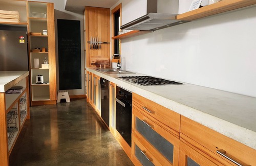 The huge timber deck and backyard is setting the scene for a perfect summer barbecue. There is an outdoor Ziergler and Brown barbecue with a grill and hot plate. The indoor kitchen features beautiful concrete benchtops, functional storage spaces and Miele appliances throughout. The kitchen is fully furnished with a microwave, large fridge, pots and pan, rice cooker and cooking utensils.