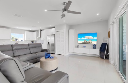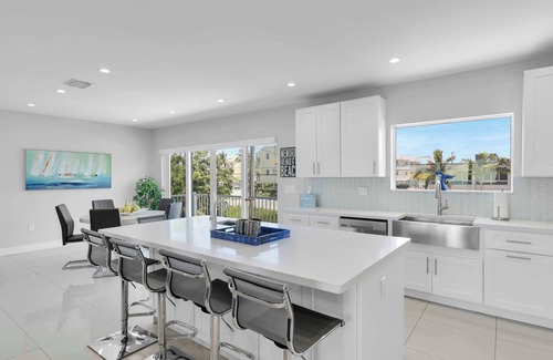This modern duplex offers an array of exceptional features tailored for your special event. With six beautifully appointed bedrooms and five baths, there's ample room for up to 16 guests. Enjoy the convenience of two fully equipped kitchens, two inviting pools, and a generous 80-foot dock for easy access to water activities. Spend your pre-wedding days relaxing by the pool or enjoying leisurely outdoor gatherings on the expansive terraces that connect the two sides of the home. Everything you need for lavish entertaining and comfortable accommodations is at your fingertips.
