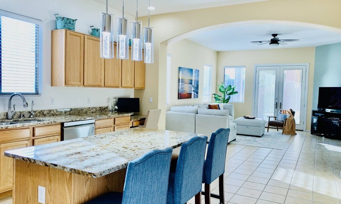 Come fall in love with this 2000sf bright and spacious home with a large private master bedroom suite with a king bed. Located 5 mins to I-10, in a safe and quiet neighborhood close to Raytheon, Amazon, Tech Park, Sonoita Wineries, Colossal Cave, Saguaro National Park East, parks, and hiking trails. Truly your home away from home! Spacious, extra living room, BBQ grill, firepit amenities galore, 2 mins drive to the grocery stores. Perfect for families and travelers. More space than you need.