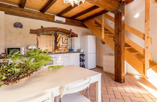 Downstairs there are: a kitchen (equipped with 4 hotplates, oven, microwave, freezer, electric coffee machine) with dining table and exit to the terrace / pool.