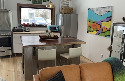 Enchanting couple’s retreat with huge 16” rain shower, soaking tub and bedroom on second floor that opens onto a big deck in a grove of walnut trees...like living in a tree house. Beautiful contemporary cedar and glass home finished in 2021. Cozy living room, kitchen with wood deck out the kitchen door. Laundry/office area also opens on the upper deck. Home is full of local art and woodwork made from trees removed to build the house. Lots of wildlife to watch and enjoy, 2 acres to roam if you like. (local Registration # 1517291-1)