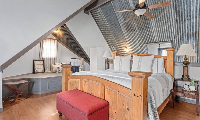 Upstairs is a large loft bedroom with a king bed. There is a large wood built in seating area perfect for putting suitcases and personal belongings. Looking over the loft is the perfect place to see the rodeo and ranch collectibles your hosts have acquired from family.