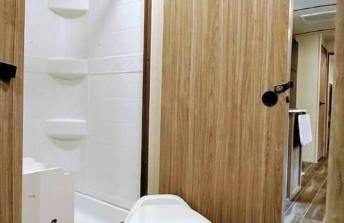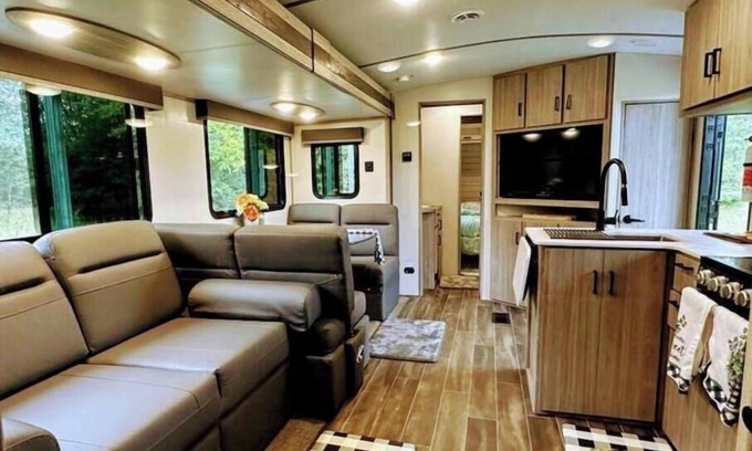 Our camper is equipped with all essentials for a cozy stay: a comfortable sleeping area, well-appointed kitchenette, and modern bathroom, large windows invite the forest's indoors