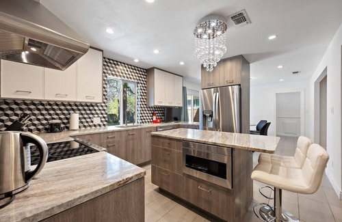 ✔ Contemporary Appliances: Our kitchen is equipped with sleek stainless steel appliances including an LG refrigerator, a high-end Frigidaire oven, an electric stove with five burners, and a unique microwave drawer in the kitchen island, ensuring a blend of elegance and functionality.