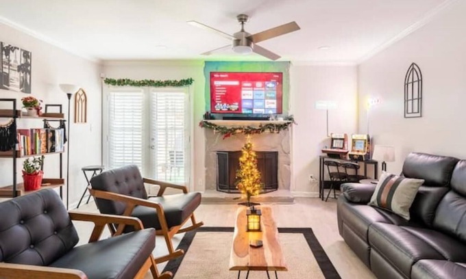 Welcome to our delightful, Georgia-themed in Peachtree Corners, GA! Immerse yourself in the charm of the Peach State with our newly renovated townhouse. Perfect for both long stays & short stays, traveling professionals & families alike! This 2 level, 2 bedroom/2.5 bathroom townhome (1200 sq ft) features Georgia PEACH and Chattahoochee RIVER themed bedrooms, a cozy living room, a BAGEL BAR for breakfast, and an ARCADE CORNER featuring Pac-Man & NBA Jam for nostalgic gaming!