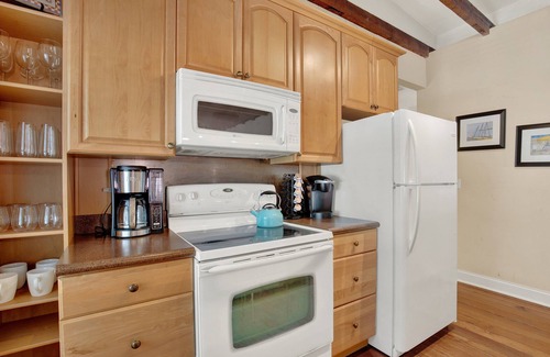 The fully equipped kitchen is a chef's delight, featuring full size appliances, ample prep space, and all the cookware you need to whip up a delicious meal. Gather around the dining table with seating for four or enjoy a casual breakfast at the bar. Whether you're preparing a gourmet feast or simply brewing your morning coffee, this kitchen is sure to impress. A nearby washer and dryer add convenience, allowing you to pack light and refresh your wardrobe throughout your stay.