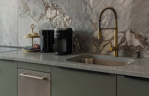 A fully equipped kitchen with a dishwasher, coffee maker, marble countertops, and all the essentials for cooking.