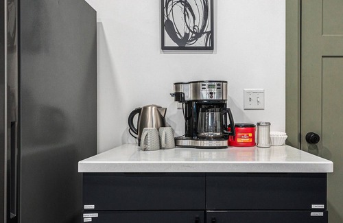 The fully stocked kitchen provides everything you need to cook and dine in. With ample counter space, a breakfast bar with two stools, and all the essentials, cookware, dishes, utensils, and basic spices, it’s designed to feel just like home. A dishwasher adds extra convenience, and we’ve included coffee and supplies to start your mornings right.