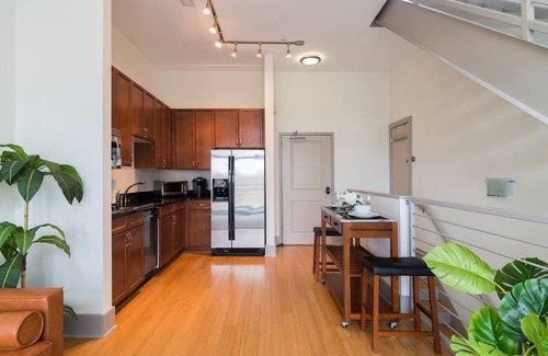 This is a perfect one bedroom flex office/two bedroom multi level apartment with soaring ceilings. The main floor is equipped with a kitchen, and open living room. The first floor has an office, with a sofa bed, separate washer/dryer, a king bed with a huge walk in closet. The bathroom is spacious with a large shower. The third floor is a private 220 sq ft roof top, with views of Uptown Charlotte. We are located in the Dilworth neighborhood but enjoy all of the convenience of South End.