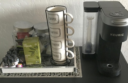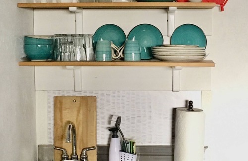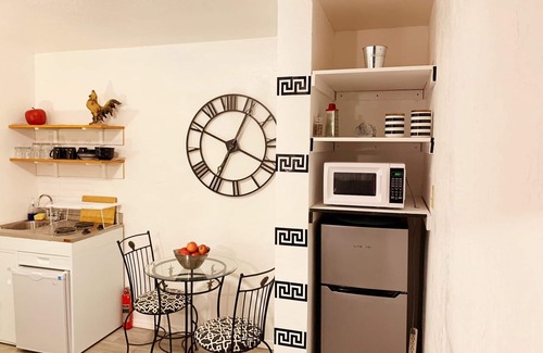 This is a studio apartment, nonsmoking, with a comfortable queen bed with high thread count sheets, & a sleeper sofa. Sleeps up to 3. Enter your unit through a key pad, it has its' own AC, heater, a comfortable leather sleeper sofa that is supportive & gives a good nights rest. It sports a Keurig coffee maker, microwave, toaster, a fridge with a small freezer (4.4 cu ft), a desk & chair, 6 drawer dresser, a Roku smart TV that swings out for viewing to the sofa or the bed, security screen door, ceiling fan, blow dryer, clothes steamer, fresh linens & towels. Guest laundry room is available, laundry detergent and dryer sheets are provided. A kitchenette with sink, two electric burners, dishware, utensils, pans, full bath, propane gas grill, all located in a safe neighborhood. 55” smart TV, WiFi, Paramount, Hulu, Roku Tv, or Tubi.