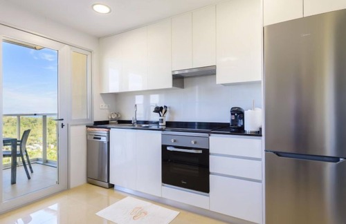 "Ciudad Jardin", 3-room apartment 80 m2 on 8th floor. Practical and comfortable furnishings: living/dining room with dining table, digital TV, flat screen, air conditioning and forced-air heating. Exit to the terrace. 1 room with 1 french bed (150 cm, length 200 cm), bath/bidet/WC, air conditioning and forced-air heating. 1 room with 2 beds (90 cm, length 200 cm), air conditioning and forced-air heating. Kitchen (oven, dishwasher, 3 induction hot plates, toaster, microwave, freezer). Shower/bidet/WC. Large terrace 19 m2. Terrace furniture. View of the sea and the resort. Facilities: washing machine, iron, hair dryer. Internet (WiFi, free). Parking space n 154 (roofed) at the house. Please note: non-smokers only. VT-44531-CS