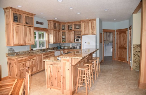 There is wheelchair accessibility to the main floor, but it is not ADA compliant. An electric heat pump provides central heating and cooling, and the home includes an impressive gas fireplace and granite counters throughout. Floors are tile and hardwood. There is a large covered balcony off of the upstairs entertainment area for birds-eye viewing of the river and woodlands. The entertainment area has plenty of seating with a futon, reclining sofa, and 2 recliners. A DVD player and DVD library accompanies the 55" LED TV with internet connectivity. Books for adults and children and board games are available for use as well as outdoor sports equipment and games.