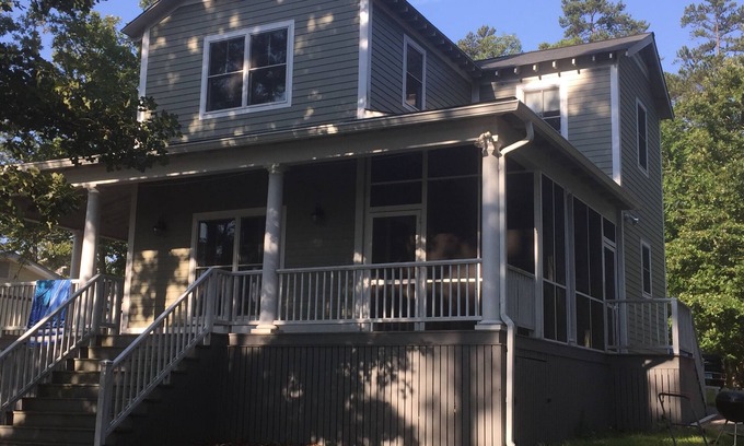 This 3 bedroom, 2 full bath, 1750 square foot cabin is the perfect lake getaway. The house has a deep wrap around front porch overlooking Clarks Hill lake. The lake is clearly visible from all of the rooms in the house. Two of the bedrooms have plush-top queen beds and the third bedroom is set up as a kid's bunk room and contains 2 twin beds and a set of bunk beds. The entire house was freshly painted in 2024.