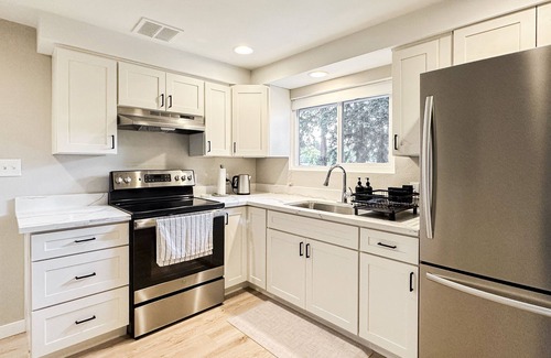 This is a 2 bedroom 1 bathroom home. The washer/dryer is in the garage. The whole home is newly remodeled and freshly decorated. The kitchen is equipped with stainless steel appliances and is fully stocked with cookware, silverware, servingware, spices, coffee & tea for all your cooking needs. All beds are outfitted with high-quality mattresses and linens.