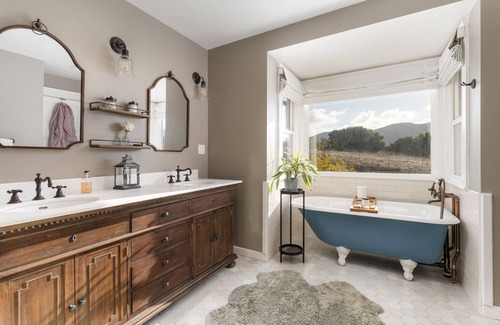 Each of the three primary bedrooms is outfitted with a king-size bed, organic mattress, and luxury linens to ensure a restful night’s sleep. The primary suite includes French doors that open onto the front porch, and a spa-inspired bathroom featuring a clawfoot bathtub and a large double shower with sweeping views of the landscape. The guest bedrooms each have their own adjoining or nearby bathrooms with walk-in showers.