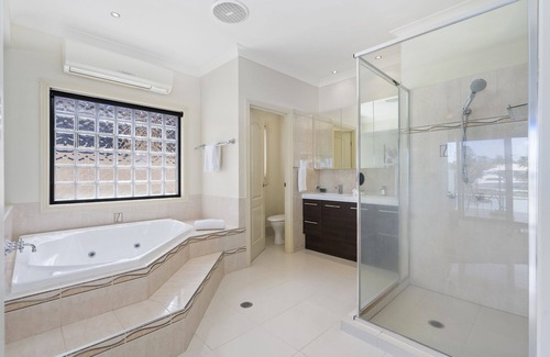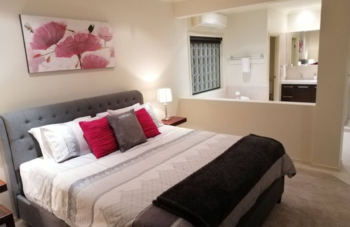 Bedroom 2: King bed or depending on your requirements the configuration can be split to 2 single beds. Also has a TV and its own outdoor patio. Full ensuite bathroom with bath tub and separate shower. It has a separate vanity and a separate toilet which is accessible from the hallway, so guests in the other bedroom or guests you might have over, will have complete privacy as well. Reverse cycle air conditioner.