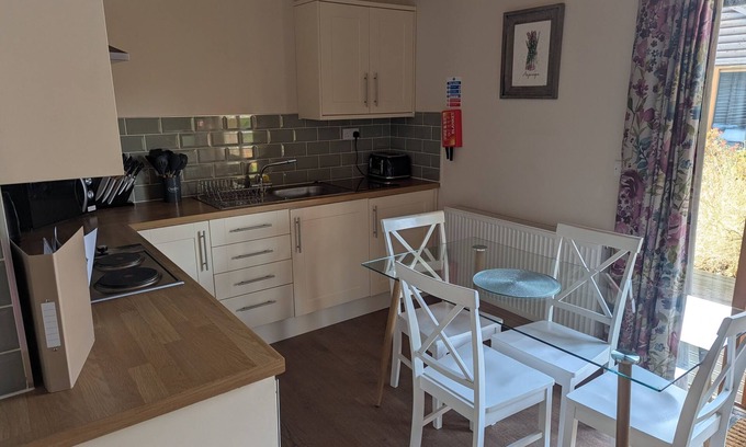Modern yet rustic designed lodge, ideal for families or couples. One master king size double and one twin. Vaulted, spacious open plan lounge/kitchen area with patio doors leading to covered decking area with garden furniture.