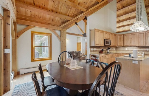 Exuding the most charming New Hampshire vibes, this stunning retreat is perched in the greenery and foliage that is absolutely gorgeous year-round, yet come Fall, everyone will be spoiled. Upon entering, the high vaulted ceilings and rustic cabin-feel will set the tone for a nostalgic and relaxing vacation away. After a full day of skiing or playing in the private yard, the fireplace will assist in warming up frozen hands and toes and the chef of the group can slide into the fully equipped kitchen to whip up those family-favorite recipes everyone craves. Plus, the kiddos can easily get their wiggle out in the downstairs game room with a few rounds of foosball!