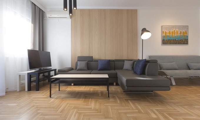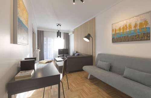 80m² apartment,on the 4th floor (one of the 2 twin apartments that we host), belonging to and remodelled by our architectural office: d_code ARCHITECTS. Kitchen, bathroom, bedrooms and furniture have been renovated with wooden elements on floors and walls creating a classy environment.Lighting to ensure atmosphere,Wifi and cable TV,telephone(for national calls only), offices.One master bedroom and also a second room(with potential of complete privacy)with couch that can be turned to double bed.