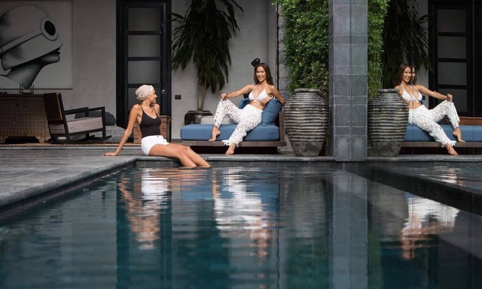 The first master bedroom sits behind the living space with a connecting door to the second bedroom through the walk-in closet while the second master bedroom sits right at the end of the pool near the main entrance. All two bedrooms are fused with unique art accessories and fitted with high-end furnishings such as extra king-sized beds with special bed toppers, comfy sofas on a rattan carpet and blackout curtains draped on a floor to ceiling glass sliding doors. Each room has its own walk-in closet and en-suite bathroom. The en-suite bathroom on the first and third bedroom features a bath tub carved from a natural stone and all are fitted with twin vanity sinks, rain shower and a toilet.