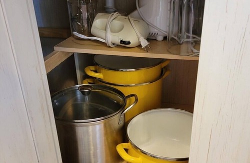 Kitchen has lots of nice, matching glasses and stemware, ample cooking supplies, electric stove and oven, clean refrigerator with an ice maker, fresh dish towels, and cleaning supplies. We do not have a dishwasher.