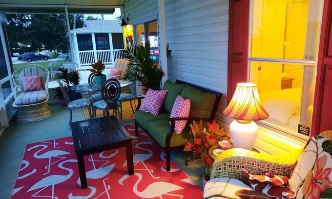 Large screened in porch with table and chairs, lot of lounging options, colorful plants, and fresh salty breezes.