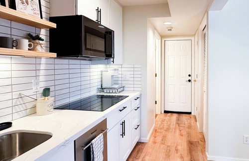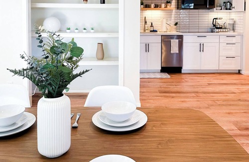 Our fully equipped kitchen includes a full freezer/fridge, microwave, dishwasher, and an induction cooktop to allow you to prepare home cooked meals. We have essential cooking utensils, wine glasses, and a Keurig coffee maker with coffee pods provided. There is a dining table which can accommodate a family.