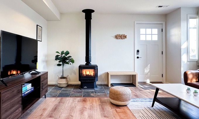 There is a cozy gas fireplace in the living room, a smart ROKU TV, and a bluetooth/vinyl record player to enjoy your stay listening to some classic music! There is also a couch which can convert into a futon for additional sleeping in the living room.