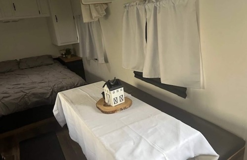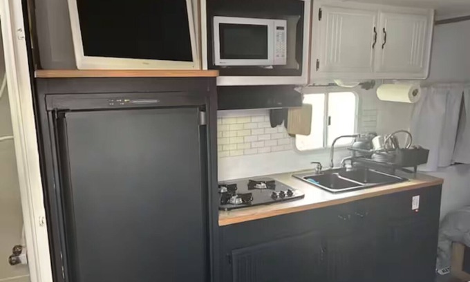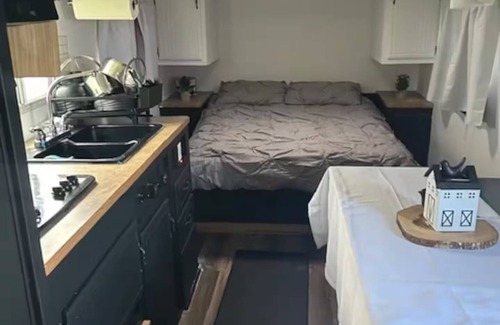 This clean and cozy trailer space offers privacy and all amenities included-Free parking TV fully equipped kitchen for all your cooking needs Heating/AC complimentary snacks water and a BBQ grill available for use