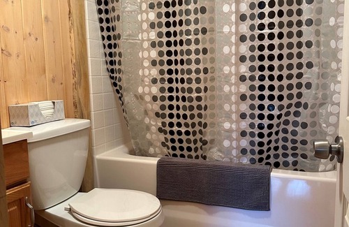 Cedar cabin. Pet friendly. ,One bedroom double bed, loft with two single beds, futon. Kitchen includes all cookware and utensils. Has standard size fridge/freezer, microwave and oven. This unit includes a full size bathroom with tub shower combo. There is also a washer and dryer for your convenience.