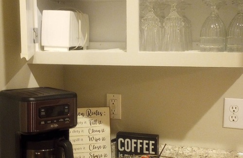 Microwave, refrigerator, dishwasher, coffee maker, toaster, stove, oven, and smokeless indoor grill - EVERYTHING you need to prepare, cook & eat meals!