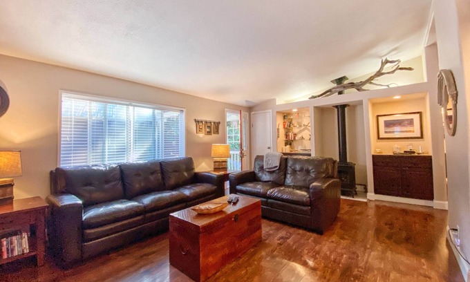 In the living room, you'll find a very comfortable leather sofa and loveseat which provides the relaxing atmosphere you're looking for after a day of exploring Orcas Island and its many gems.