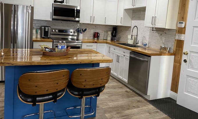 The kitchen is fully equipped kitchen with new stainless steel appliances including a fridge, stove, oven, dishwasher, microwave, toaster, waffle iron, electric grill kettle, Keurig with coffee pods, water cooler, and fully stocked kitchen including pots and pans & day to day necessities.