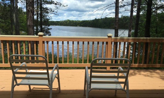 Sleeps 6. Exclusive setting on private lake. Experience quiet nights and clean, fresh air. Enjoy coffee and beautiful sunrises from the spacious upper deck or grill dinner on the walk-out lower deck. Swim in crystal clear water, relax and soak up the sun on a private raft, catch fish from the dock or troll for big ones while drifting lazily across the lake in the rowboat or canoe. Kayak in solitude or join a friend in the pedal boat. At night tell stories and eat S'mores around the campfire and listen for the call of the loon. In the winter snowmobilers enjoy deep lake effect snow. Located just 1/2 mile from the Blue Bear ORV/snowmobile trailhead; 1 mile from the Hide-A-Way Bar; about midway between Traverse City and Petoskey. Wine tours, 8 ski resorts, 17 golf courses and two casinos are a short drive away.
