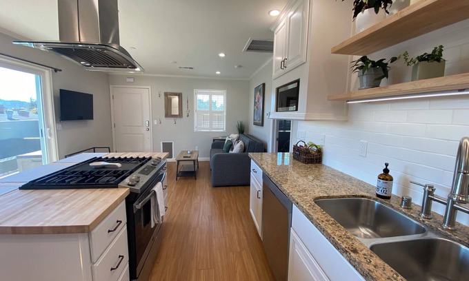 Your home away from home in Burbank with one bedroom and a great balcony with a view. Step into this penthouse featuring a queen bed, a cozy living room with a queen sofa bed, and a fully stocked kitchen. Enjoy the superb amenities like a laundry room, Central AC, BBQ, off-street parking with EV charger, and many more.