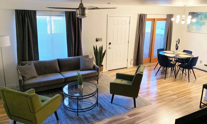 The Clean Quiet Luxurious Condo is fully equipped with modern amenities to ensure a comfortable stay for you and your guests. Enjoy two elegantly appointed bedrooms featuring queen-sized beds, a bright living room with access to a relaxing shaded patio, and a fully stocked kitchen perfect for pre-wedding gatherings. The property also includes complimentary Wi-Fi, three Smart TVs, central air conditioning, and shared access to laundry facilities and a refreshing swimming pool. You'll appreciate the convenience of keyless entry and thoughtful touches like complimentary toiletries, making your stay both luxurious and hassle-free.