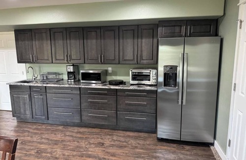 Unit includes a kitchenette, dining room area, living room, and a separate entrance, patio, and section of the yard. The kitchenette includes a stove top burner, instant pot, air fryer and convection oven, coffee maker, kettle, and spacious fridge.
