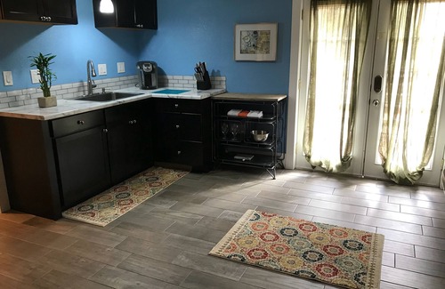 The Garden Suite is very spacious including 2 bedrooms, 1 bathroom, kitchenette with bar sink & refrigerator, living room, dining area, laundry room, and outdoor patio. It offers a large flat screen TV with Comcast Cable including the full sports and movie package. Wifi is also included. There are king size beds in both bedrooms. The bathroom has warm, wonderful, heated tile floors. Begin your mornings with a cup of Keurig coffee !