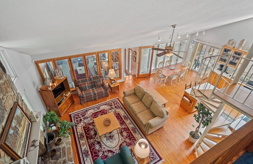 Four bedrooms and two bathrooms, with an outdoor entertainment building for gathering together. There are three refrigerators for your convenience and storage needs. Four new televisions (32 inch upstairs in childrens' sleeping area, 40 in. on the main level, 55 inch in the lower den, 55 in. in the outdoor entertainment building). Gas grill.
